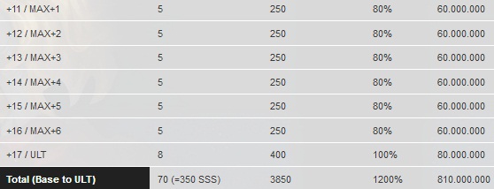 การทำ Max ต้องการ 160 ตัว (=32 Soul) แน่นอนว่า ถ้าหาสุ่ม SSS อาจต้องหากันเป็นพันตัวกว่าจะได้ครบ
